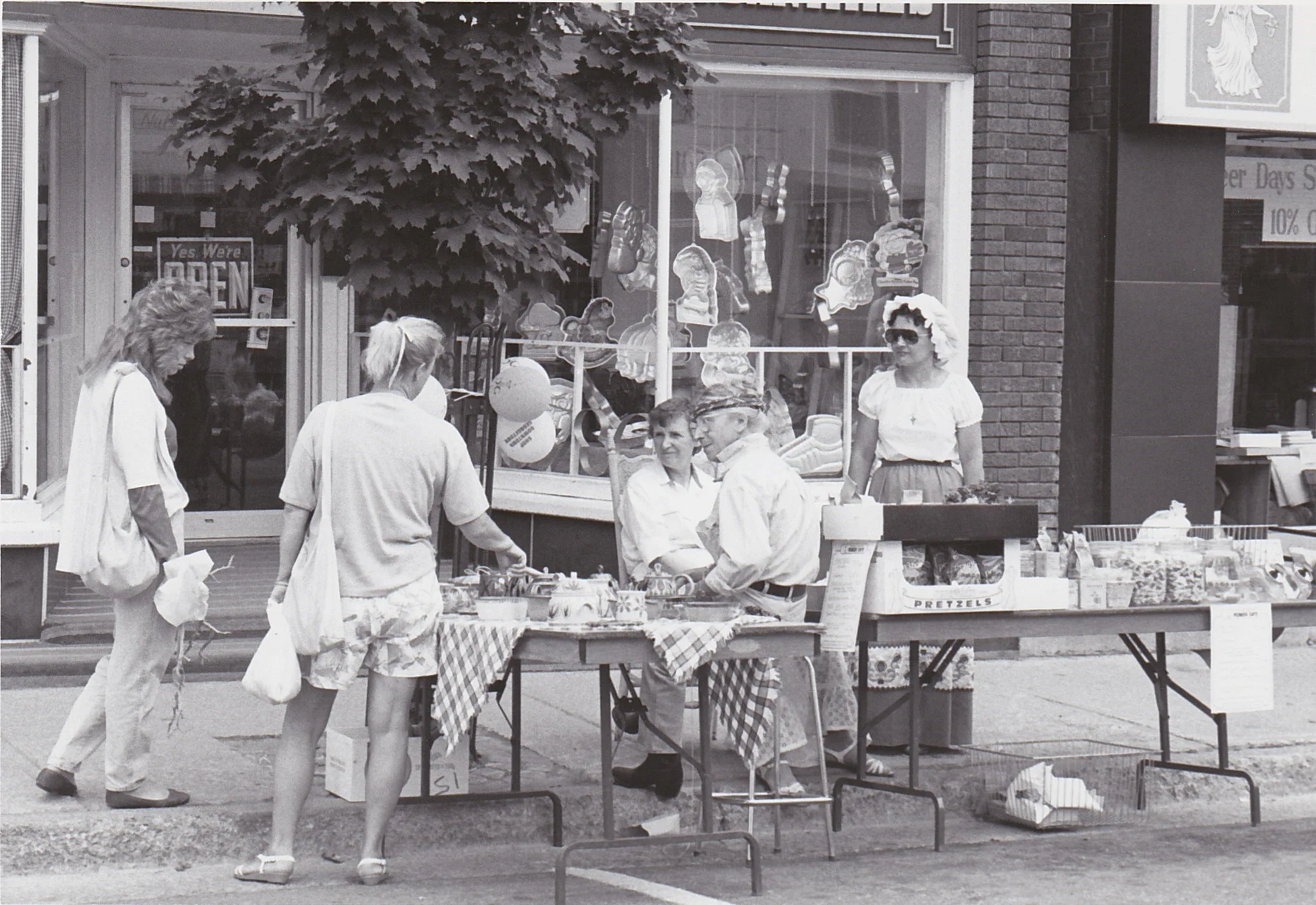 This picture shows my mom, Margaret (seated), looking after our wares in the sidewalk sale. Flora, from a lovely antiques and collectibles store next door, stands behind, in her bonnet. My aunt Janet, listening intently to a customer (and dressed in her regular casual clothes - which, as it happened, were pretty suitable for the event:) brought a big car-full of her wonderful pottery from her home in Ottawa to sell that weekend. It proved so popular that we went on featuring and selling it from our windows at 92 Main for more than a decade.
